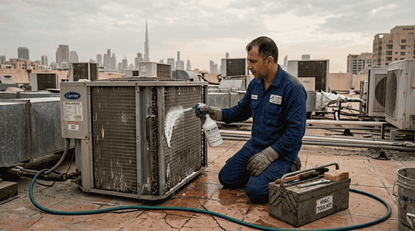 Dubai’s unique climate accelerates coil contamination. Fine desert sand penetrates outdoor units, while kitchen exhaust and vehicle emissions deposit oily residues on coils. Coastal areas add salt-laden moisture that promotes corrosion. High year-round AC usage means these contaminants accumulate rapidly.